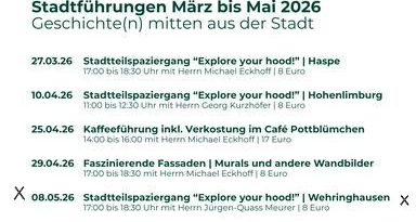 Zwischendurch am 11.08.2026 und am 25.8.2026 finden im Rahmen des Hagener URLAUBKORBS zwei mal Stadtteilführungen statt! siehe rechts >>>>>>>>>>>>